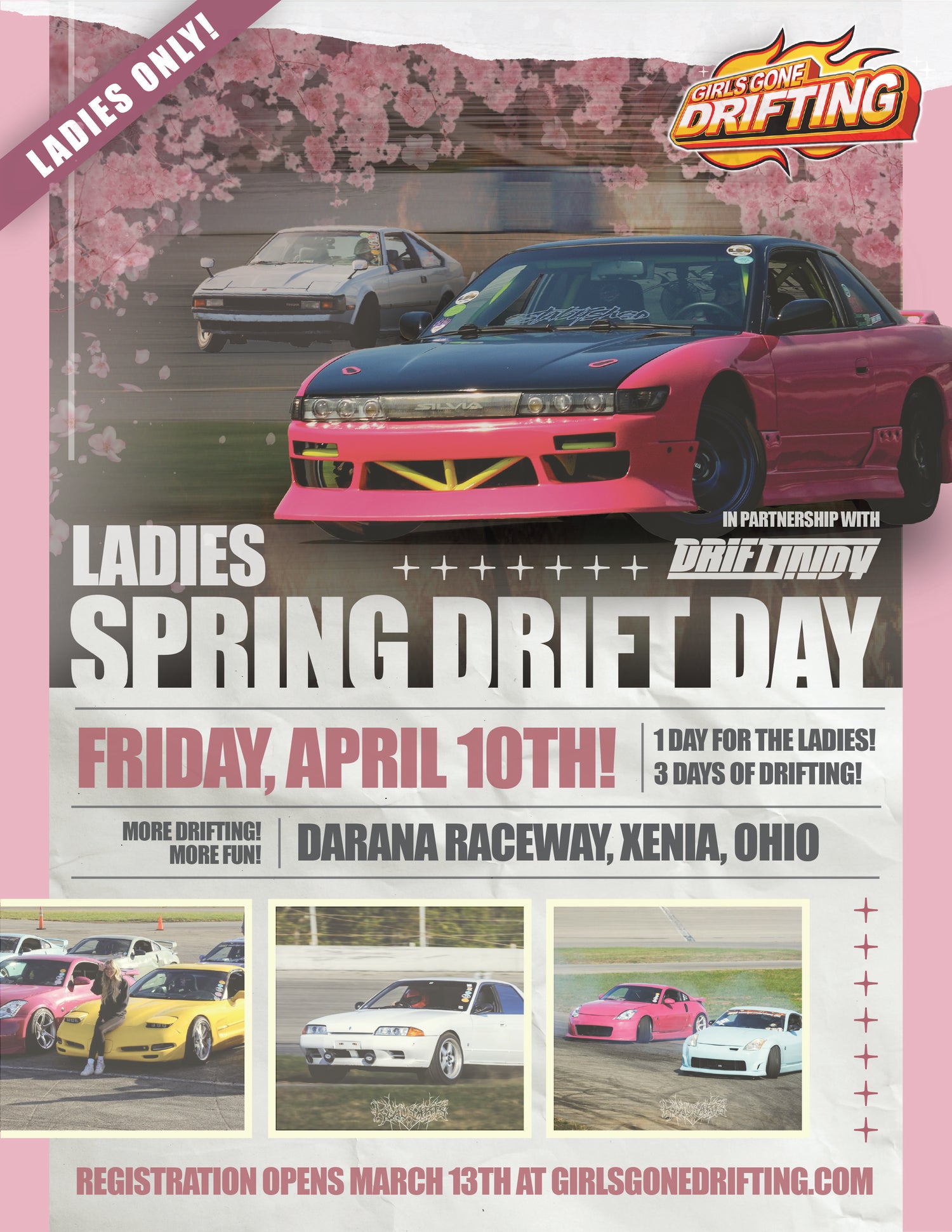 New year, same motive! Drivers registration is now open for our Spring Drift Day event! Join us for a full day of drifting and fun on April 10th at Darana Raceway in Xenia, Ohio. This event is open to ladies of all skill levels!